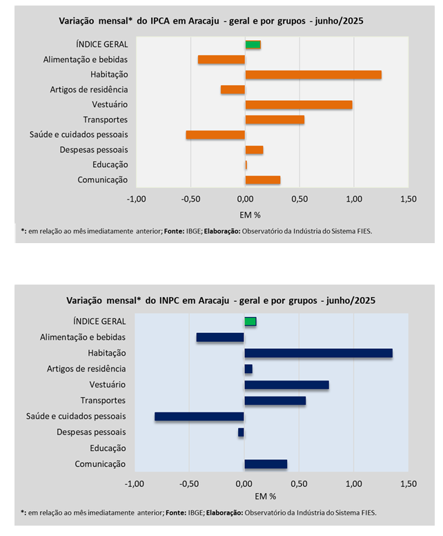 Análise realizada pelo Observatório da Indústria do Sistema FIES, com base nos dados do Instituto Brasileiro de Geografia e Estatística (IBGE), revelou que, em junho deste ano, a capital sergipana registrou inflação de 0,14%, medida pelo Índice de Preços ao Consumidor Amplo – IPCA. Com o resultado de junho, a inflação acumulada no ano de 2025 chegou a 3,45%.