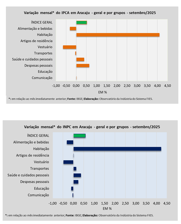 Análise realizada pelo Observatório da Indústria do Sistema FIES, com base nos dados do Instituto Brasileiro de Geografia e Estatística (IBGE), revelou que, em setembro deste ano, a capital sergipana registrou uma inflação de 0,52%, medida pelo Índice de Preços ao Consumidor Amplo – IPCA. Com o resultado de setembro, a inflação acumulada no ano de 2025 chegou a 4,02%.