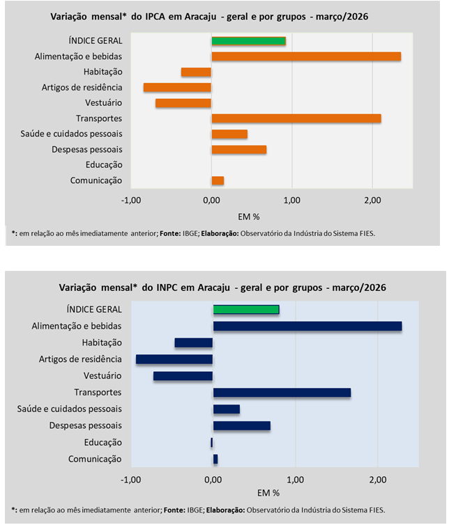 Análise realizada pelo Observatório da Indústria do Sistema FIES, com base nos dados do Instituto Brasileiro de Geografia e Estatística (IBGE), revelou que, em março deste ano, a capital sergipana registrou inflação de 0,92%, medida pelo Índice de Preços ao Consumidor Amplo – IPCA. Com o resultado de março, a inflação acumulada em 2026 chegou a 2,02%.