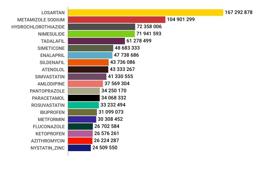 O ranking dos medicamentos genéricos mais vendidos no Brasil evidencia uma forte demanda por fármacos voltados ao tratamento de doenças crônicas, principalmente cardiovasculares. O destaque absoluto é o losartana, com mais de 167 milhões de unidades vendidas, reflexo direto da alta prevalência de hipertensão arterial.
