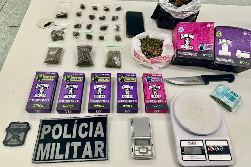 A equipe realizava patrulhamento ostensivo pela região quando avistou um homem em atitude suspeita. Ao perceber a presença dos policiais, ele tentou subir em uma moto, deixando cair dois pacotes contendo maconha. Diante da situação, os militares interceptaram o rapaz e, após a busca pessoal, encontraram mais entorpecentes. Sua companheira também foi flagrada com maconha, além de dois cigarros eletrônicos, duas balanças de precisão, uma faca, embalagens para acondicionamento de drogas e R$ 1.200 em espécie.