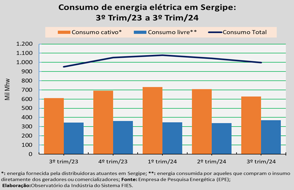 Da quantidade total de energia consumida no terceiro trimestre de 2024, 63,0% (ou cerca de 628,6 mil MWh) foi proveniente do mercado cativo. Nesse mercado, a energia é fornecida exclusivamente pelas distribuidoras instaladas em Sergipe, com o preço e as demais condições de fornecimento reguladas pela Agência Nacional de Energia Elétrica (ANEEL).
