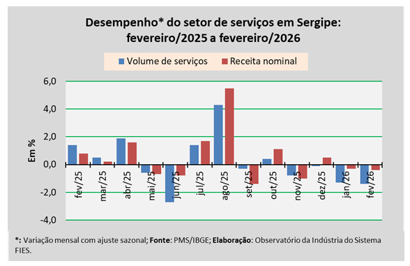 Análise realizada pelo Observatório da Indústria do Sistema FIES, com base nos dados da Pesquisa Mensal de Serviços (PMS) do IBGE, revelou que, em fevereiro, o setor de serviços em Sergipe apresentou redução de 1,4% no volume de serviços prestados, em relação ao último mês de janeiro, na série com ajuste sazonal (método utilizado para uniformizar os períodos de comparação). Na comparação com fevereiro de 2025, o volume de serviços assinalou decréscimo de 2,9%. Já no acumulado dos últimos doze meses, foi registrado um aumento de 3,6%.