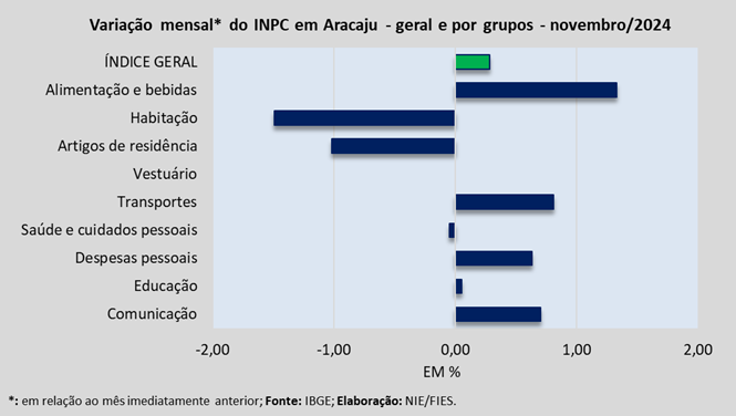 Análise realizada pelo Núcleo de Informações Econômicas da Federação das Indústrias do Estado de Sergipe (FIES), com base nos dados do Instituto Brasileiro de Geografia e Estatística (IBGE), revelou que, em novembro deste ano, a capital sergipana teve inflação de 0,24%, medida pelo Índice de Preços ao Consumidor Amplo – IPCA. Com o resultado de novembro, a inflação acumulada no ano de 2024 chegou a 4,12%.