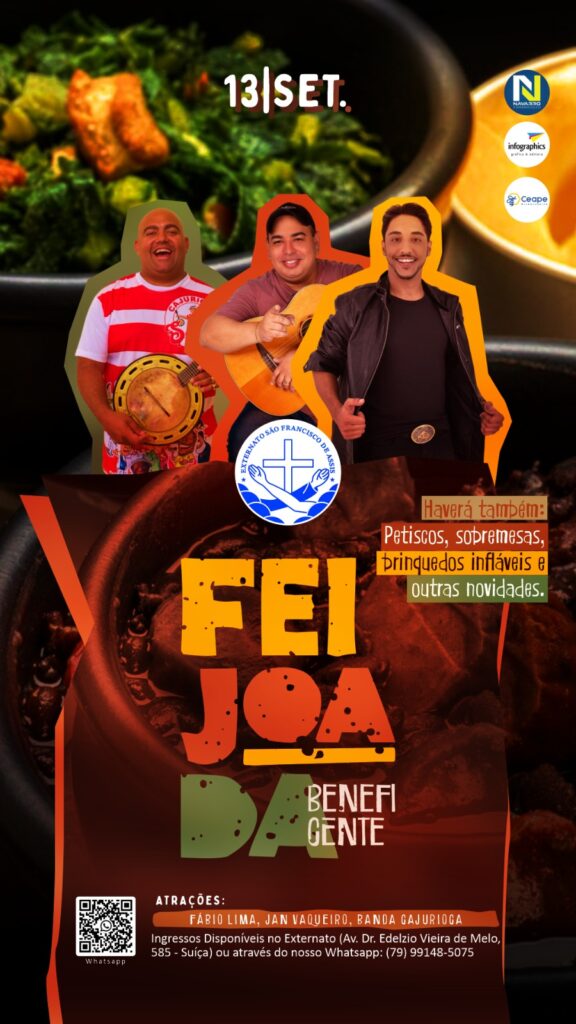 A tradicional Feijoada Beneficente do Externato São Francisco de Assis será realizada neste sábado, 13 de setembro, a partir das 12h, na sede da instituição, sob o comando de Fábio Lima, Jam Vaqueiro e Banda Cajurioca. Com apresentação dos jornalistas Fredson Navarro e Marcele Machado, o evento conta com a assessoria de imprensa da Navarro Comunicação e apoio da Infographics.