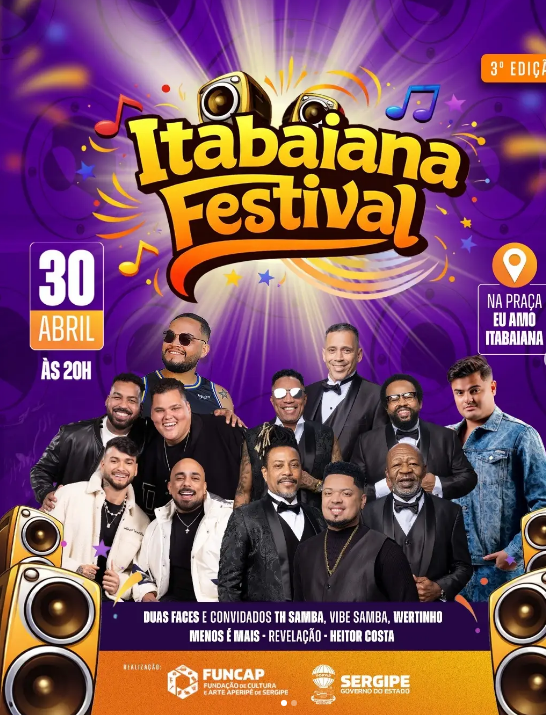 No dia 30 de abril, a programação começa às 20h, na Praça Eu Amo Itabaiana, com shows de Duas Faces e convidados, TH Samba, Vibe Samba, Wertinho, Menos é Mais, Revelação e Heitor Costa, reunindo grandes nomes do samba e do pagode para animar o público.