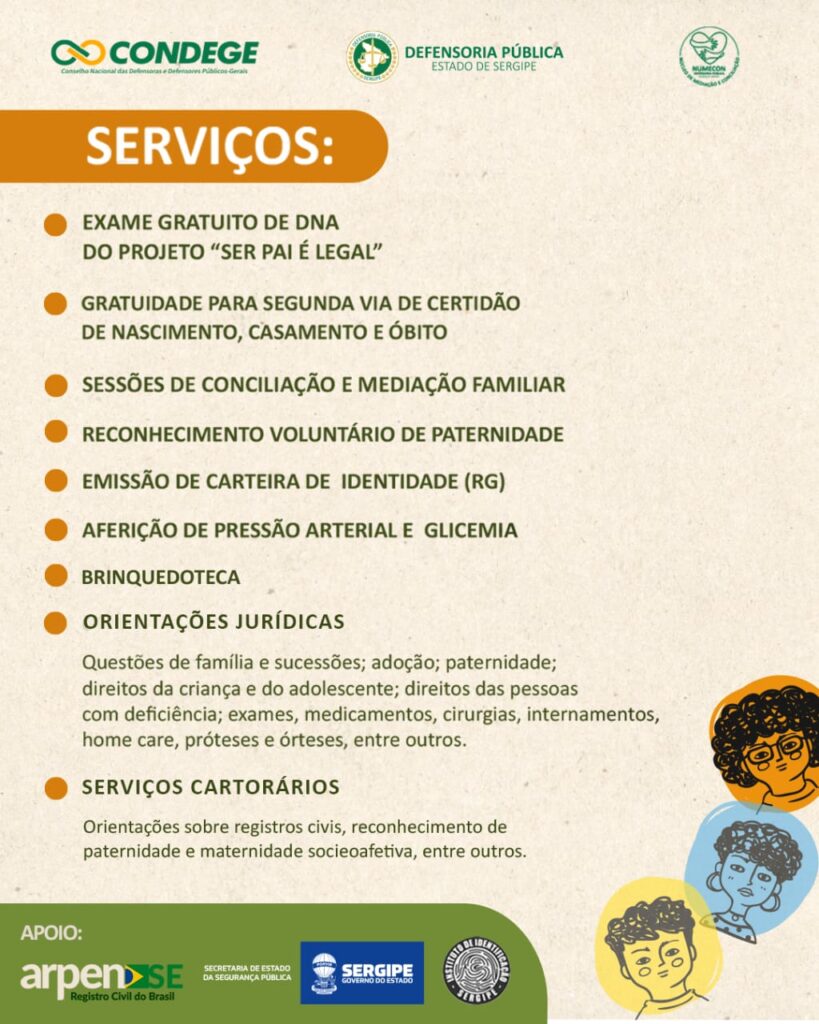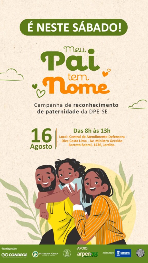 A Defensoria Pública do Estado de Sergipe, por meio do Núcleo de Mediação e Conciliação, e o Conselho Nacional de Defensoras e Defensores Públicos-Gerais (Condege) promovem neste sábado, 16 de agosto, das 8h às 13h, a campanha nacional “Meu Pai Tem Nome”, que busca garantir o direito fundamental ao reconhecimento da paternidade.