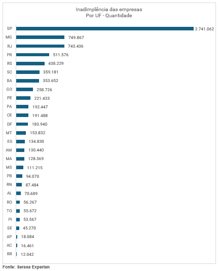 Em números absolutos, os estados do Sudeste concentraram o maior volume de inadimplidos, (total de mais de 4,3 milhões), pela região Sul (mais de 1,3 milhão) e a Nordeste (ultrapassou a marca de 1,2 milhão). O Centro-Oeste (707 mil) e o Norte (481 mil) foram os com menor volume de companhias no vermelho.