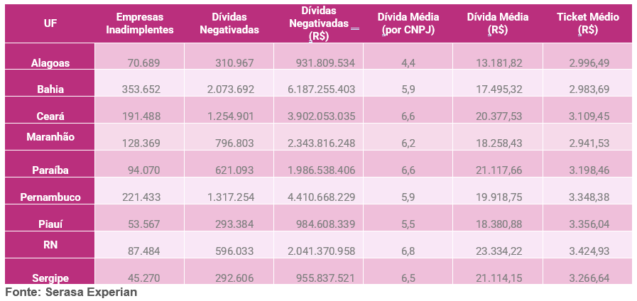 O Nordeste do país registrou mais de 1,1 milhão de empresas inadimplentes em agosto. A Bahia se destacou com o maior volume absoluto (353.652), seguida por Pernambuco (221.433) e Ceará (191.488). Alagoas apresentou a maior taxa de inadimplência proporcional do país, enquanto Sergipe e Piauí ficaram com os menores volumes.