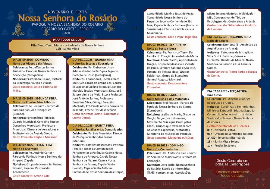 A Paróquia Nossa Senhora do Rosário, da Arquidiocese de Aracaju, divulgou a programação oficial do Novenário e Festa em honra à Padroeira de Rosário do Catete, que acontece de 28 de setembro a 7 de outubro de 2025, com o tema central: “Virgem do Rosário, ajudai-nos a sermos peregrinos da esperança!”.