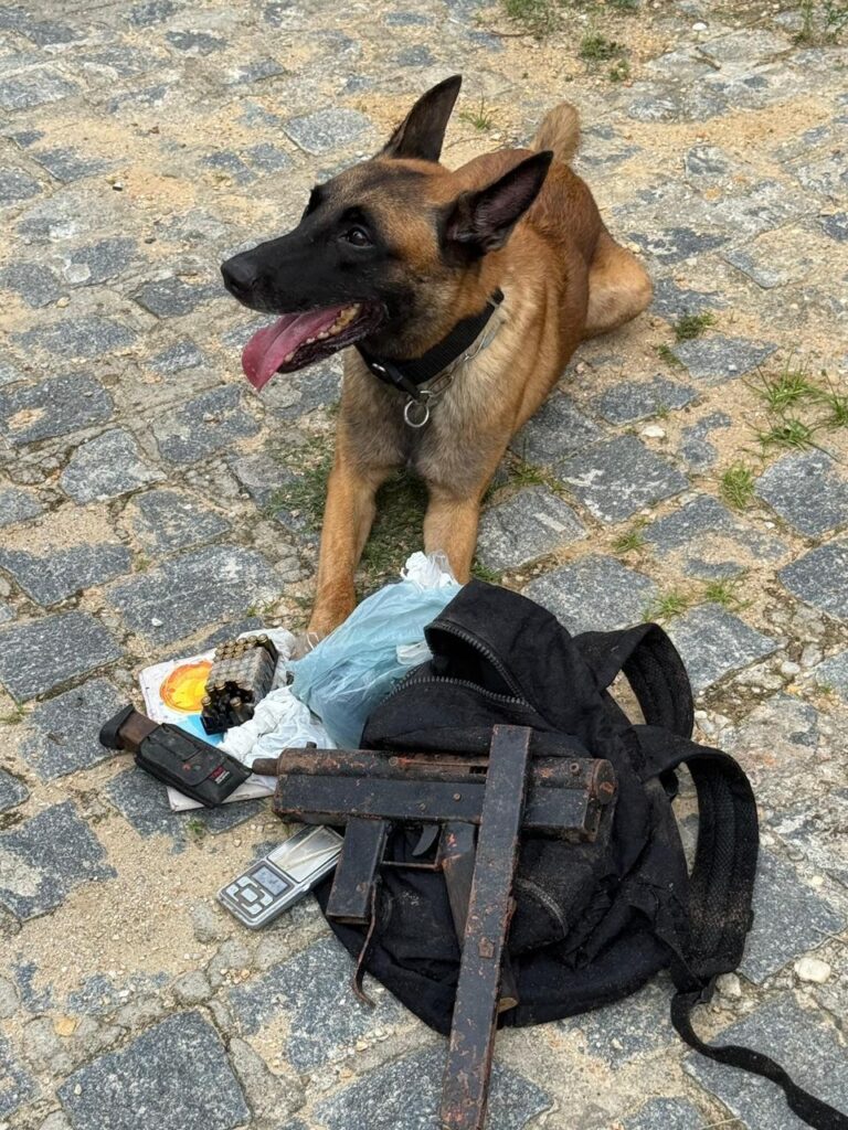 Com o auxílio do cão farejador, as equipes localizaram entorpecentes e armamentos escondidos em uma área de mata e em um sítio utilizado como ponto de armazenamento da droga.