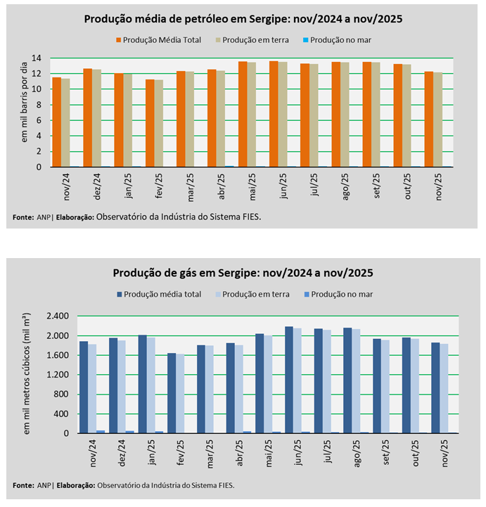 Análise realizada pelo Observatório da Indústria do Sistema FIES, com base nos dados da Agência Nacional do Petróleo, Gás Natural e Biocombustíveis (ANP), revelou que a produção de petróleo no estado, no mês de novembro, alcançou a média de 12,3 mil barris por dia (bpd), registrando um decréscimo de 7,4% em relação à produção média do mês anterior (outubro/2025). No comparativo com novembro de 2024, verificou-se acréscimo de 6,7%.