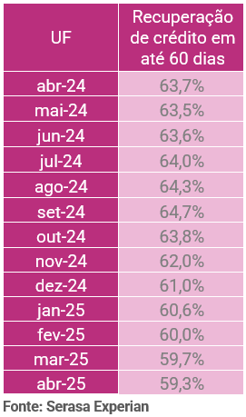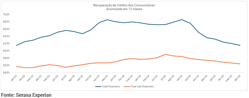 A regularização de dívidas inadimplidas por consumidores nos últimos 12 meses (maio de 2024 a abril de 2025) no setor financeiro (Bancos, Cartões e Financeiras) foi de 61,5%, o menor patamar desde janeiro de 2023. Os dados são do Indicador de Recuperação de Crédito da Serasa Experian, primeira e maior datatech do Brasil. Os dados consideram que a regularização pode ter sido feita por meio de quitação ou renegociação em até 60 dias da data de negativação. As dívidas fora do setor financeiro (luz, água, telefonia, varejo, entre outras) mostraram uma recuperação inferior, de 56,4%.