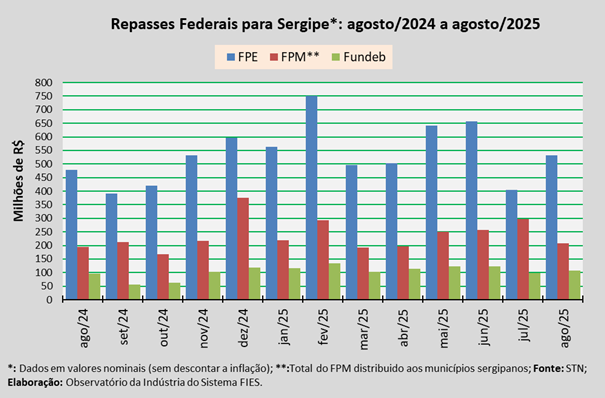 Análise realizada pelo Observatório da Indústria do Sistema FIES, com base nos dados da Secretaria do Tesouro Nacional (STN), indicou que o repasse do Fundo de Participação dos Estados (FPE) para Sergipe, em agosto do ano corrente, foi de aproximadamente R$ 532,8 milhões.