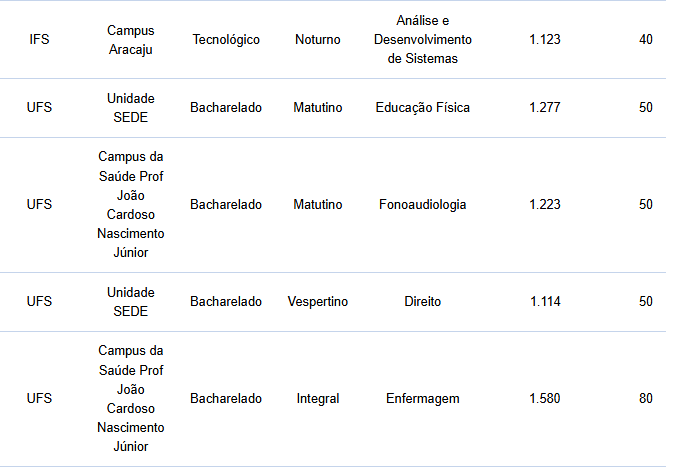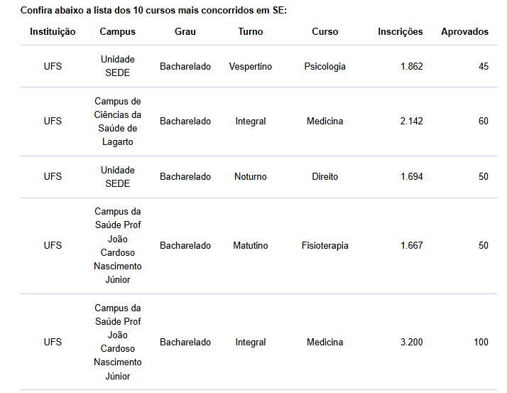 Entre as opções, o curso de bacharelado em Psicologia, da Universidade Federal de Sergipe (UFS), foi o mais concorrido. O resultado individual do Sisu foi divulgado pelo Ministério da Educação (MEC), na quinta-feira, 29 de janeiro, e está disponível para consulta no Portal Único de Acesso ao Ensino Superior.