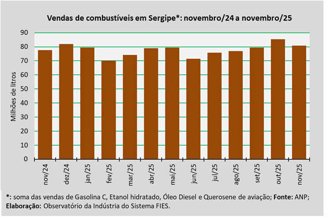 Análise realizada pelo Observatório da Indústria do Sistema FIES, com base nos dados da Agência Nacional do Petróleo, Gás Natural e Biocombustíveis (ANP), indicou que as vendas totais de combustíveis em Sergipe, em novembro de 2025, somaram aproximadamente 80,1 milhões de litros, assinalando um acréscimo de 4,3% quando comparado a novembro de 2024. Em relação ao mês imediatamente anterior (outubro/2025), as vendas diminuíram 5,2%.