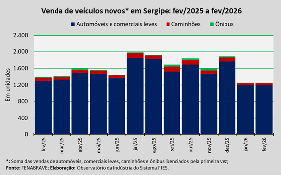 Análise realizada pelo Observatório da Indústria do Sistema FIES, com base nos dados da Federação Nacional da Distribuição de Veículos Automotores (FENABRAVE), apontou que as vendas de veículos novos no estado, no mês de fevereiro, totalizaram 1.254 unidades.